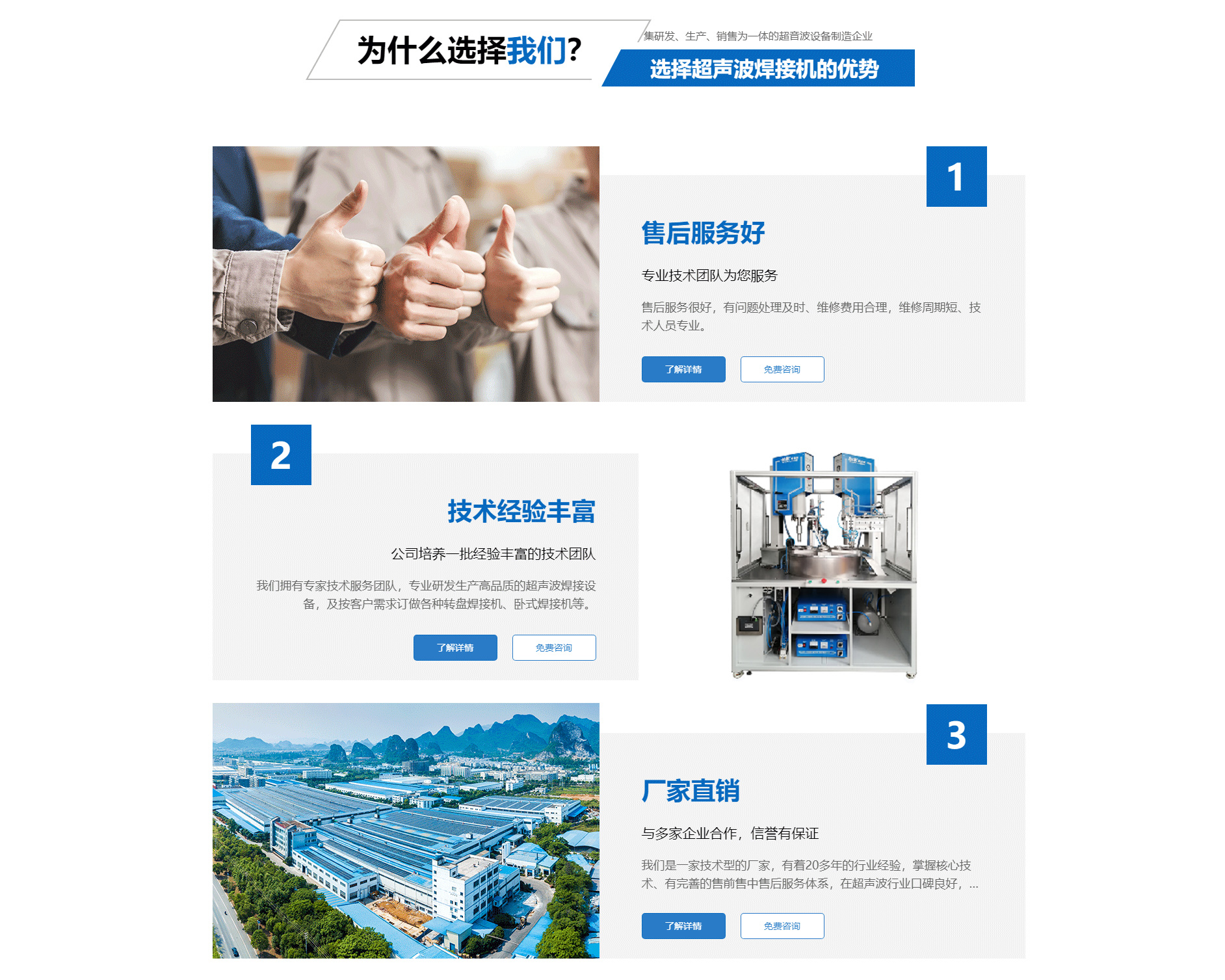 關(guān)于我們廈門勁榮機(jī)械設(shè)備有限公司是一家集研發(fā)、生產(chǎn)、銷售為一體的超音波設(shè)備制造企業(yè),主要產(chǎn)品包括多規(guī)格型號(hào)的超音波塑膠熔接機(jī)、熱板式塑料焊接機(jī)、多工位轉(zhuǎn)盤焊接機(jī)、振動(dòng)摩擦焊接機(jī)、旋轉(zhuǎn)式塑膠熔接機(jī)及配套的工裝夾具等。公司自2003年成立以來,一直致力于產(chǎn)品不斷完善中,并追求產(chǎn)品的精益求精,于2004年向國(guó)家商標(biāo)局注冊(cè)了“勁榮”牌商標(biāo),2009年榮獲廈門市商標(biāo)。 經(jīng)過多年的努力,公司已經(jīng)發(fā)展成為占地面積2000余平方米、擁有員工50余人的企業(yè)。公司一直將“品質(zhì)是企業(yè)發(fā)展的原動(dòng)力”作為經(jīng)營(yíng)理念,嚴(yán)把質(zhì)量關(guān),建立了一整套有效的安全生產(chǎn)及管理模式,不僅贏得了同行的認(rèn)可,更取得了客戶的信賴,先后與九牧集團(tuán)、路達(dá)工業(yè)、建霖集團(tuán)、西伯電子、蒙發(fā)利實(shí)業(yè)、松霖科技、銥科集團(tuán)、科司特電子等公司建立了長(zhǎng)期的合作關(guān)系。 面對(duì)已經(jīng)取得的成績(jī),我們不驕不滿,因?yàn)樯钪獦I(yè)績(jī)只能代表過去,只有靠良好的產(chǎn)品質(zhì)量和完善的售后服務(wù)才能在客戶中口碑相傳,在...